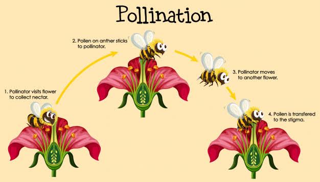 Pollination helps the plant reproduce by transferring pollen grains from the anthers ( in males) to the stigma ( in females) through insects such as bees when passing on flowers to complete a successful fertilization process and the pollen grain will germinate to produce fruits later.
